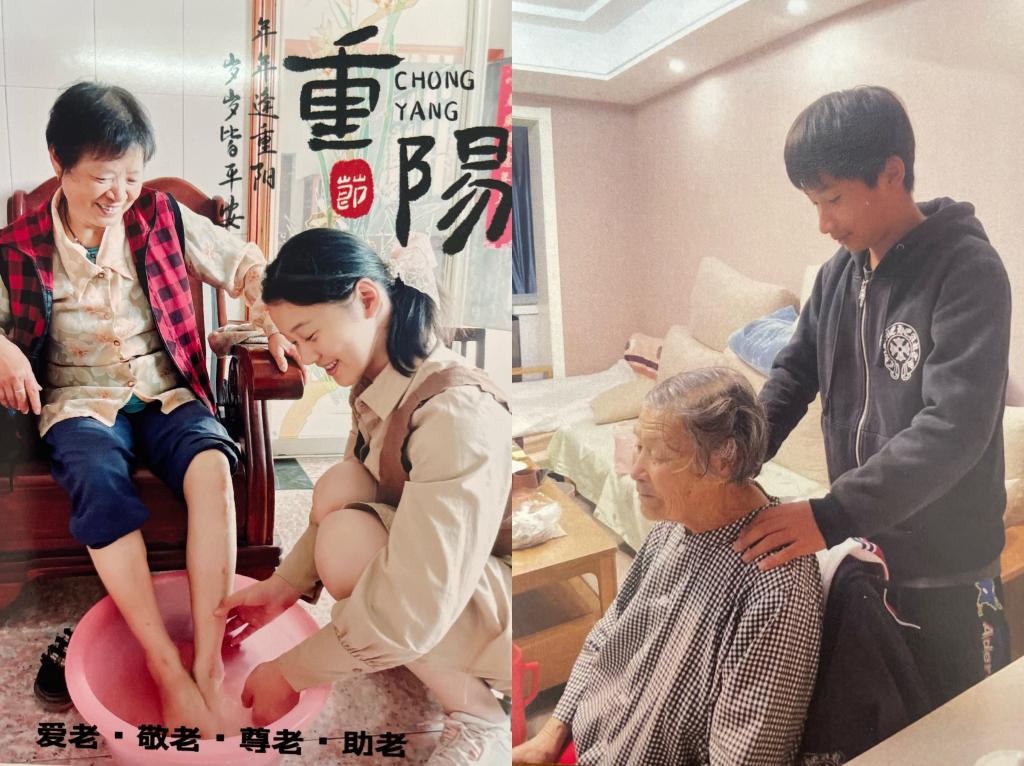 10月4日是重阳节,孝亲敬老是中华民族传统文化的精神传承。学校向所有学生发出倡议:用实际行动为家里长辈做一件力所能及的事,初一年级为长辈捶背、捏腿;初二年级为长辈打扫起居室;初三年级为长辈做一个拿手菜。