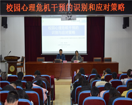 活动中,胡庆利老师从自身成长经历讲起,以一个个真实个案为切入点,围绕“职校生异常心理识别”、“校园心理危机预防”和“心理危机应对策略”三个方面深入浅出地剖析了校园心理危机发生的因素,如何在学校教育过程中通过情绪、认知、行为、生理等异常行为识别心理危机,如何运用人类心理活动的规律化解危机,结合家庭、学校、社会各方面帮助学生。胡老师的精彩演讲,既有前言理论知识,也有实际个案,更有实操指导,与会教师聚精会神,会场气氛浓烈。