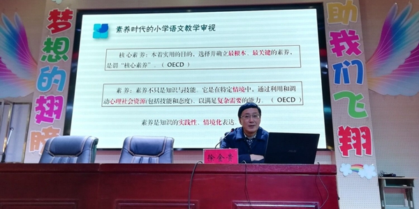 海安市教师发展中心主任、特级教师徐金贵为江阴学员作了专题讲座“素养导向的小学语文共生教学”。他从素养时代的小学语文教学审视谈起,提出优化小学语文教学的共生路径主张,并提供了小学语文教学的共生策略:结构化、共学力、项目化。学员们感到,徐主任讲座既有高屋建瓴的先进理论解读,也有草根一线的贴地实践推进,令人余味无穷。
