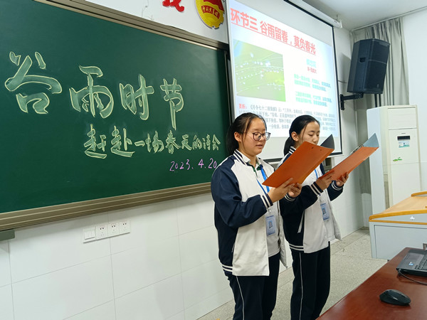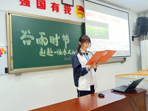 当天,校区江阴市全民阅读促进会会员、周庄镇“种子阅读推广人”倪传余老师为同学们讲解了谷雨节气的由来、物候与习俗。活动现场,同学们分别以“谷雨时节,雨生百谷”“谷雨花信,春色渐深”“谷雨留春,莫负春光”为主题,吟诵了元稹《咏廿四气诗·谷雨春光晓》、范成大《蝶恋花·春涨一篙添水面》、仇远《浣溪沙·红紫妆林绿满池》、郑板桥《谷雨》等谷雨节气经典诗词,感悟了春天的绚丽美好与蓬勃生机,表达了向下扎根、向上生长、不负青春韶华的美好愿景。