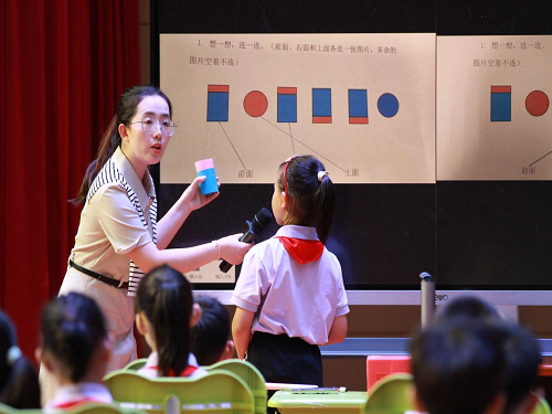 江阴市礼延学校凡祁老师执教的《观察物体》一课,以“观察鸟巢”为切入点,引发学生从不同角度观察物体。随后,以“观察投票箱”和“观察圆柱、长方体和球”两大活动驱动教学,引领学生在“定方向—齐观察—答答题”的程序化活动中,有目标、有方法、有次序地观察。练习环节则依托平板、小盒科技等技术手段实现数据驱动教学,即时反馈精准评价。