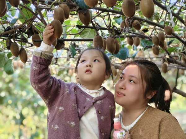 当天下午阳光正好,在园区工作人员与教师的带领下,亲子家庭开启了“猕猴桃探秘之旅”。一进园,孩子们就惊喜地发现圆润的猕猴桃已经挂满了交错缠绕的藤蔓,他们还认真观察着猕猴桃藤蔓的搭建方式和叶片形状。教师结合提前准备的生长过程图片与现场植株,用通俗易懂的语言讲解了猕猴桃从春天开花到秋天成熟的生长周期,还介绍了其椭圆形、带绒毛的外形特征以及富含维生素C的营养价值。孩子们积极参与互动提问环节,现场学习氛围热烈。