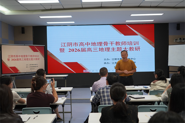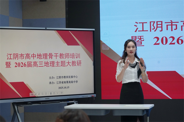 为提升高三地理复习教学的针对性与实效性,10月15日,江阴市高中地理骨干教师培训暨2026届高三地理主题大教研活动在江苏省南菁高级中学顺利举行。本次活动由市教师发展中心主办,以“基于学情诊断的高三地理精准复习”为主题,全市各高中高三地理备课组长及骨干教师参加了活动。