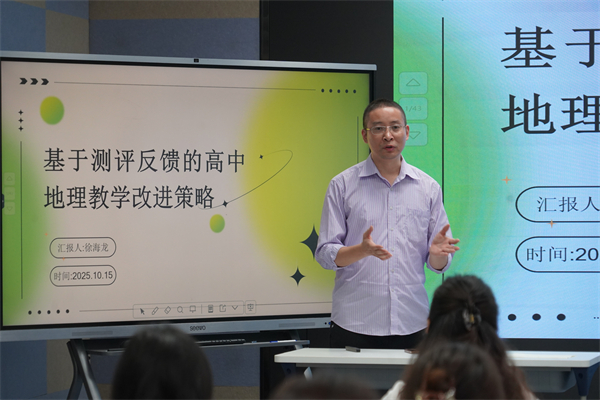 南菁高中徐海龙老师作题为《基于测评反馈的高中地理教学改进策略》的专题讲座。徐老师结合江浙皖联考数据,分析了学生知识盲区与思维断点,提出落实“课前预习诊断、课中师生对话、课后作业反馈”的精准诊断路径,并以《河流侵蚀地貌》为例,展示了高考题“教学化”转化与互动课堂设计的实践方法。