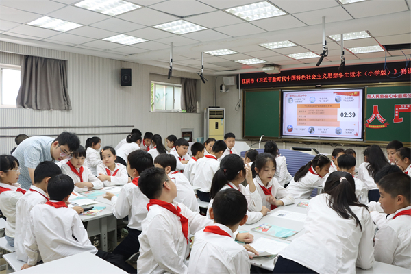 本次比赛教材内容为《习近平新时代中国特色社会主义思想学生读本(小学版)》,经校、片选拔,市级比赛在晨光实验小学、辅延中心小学和人民东路小学分3组同时开展。