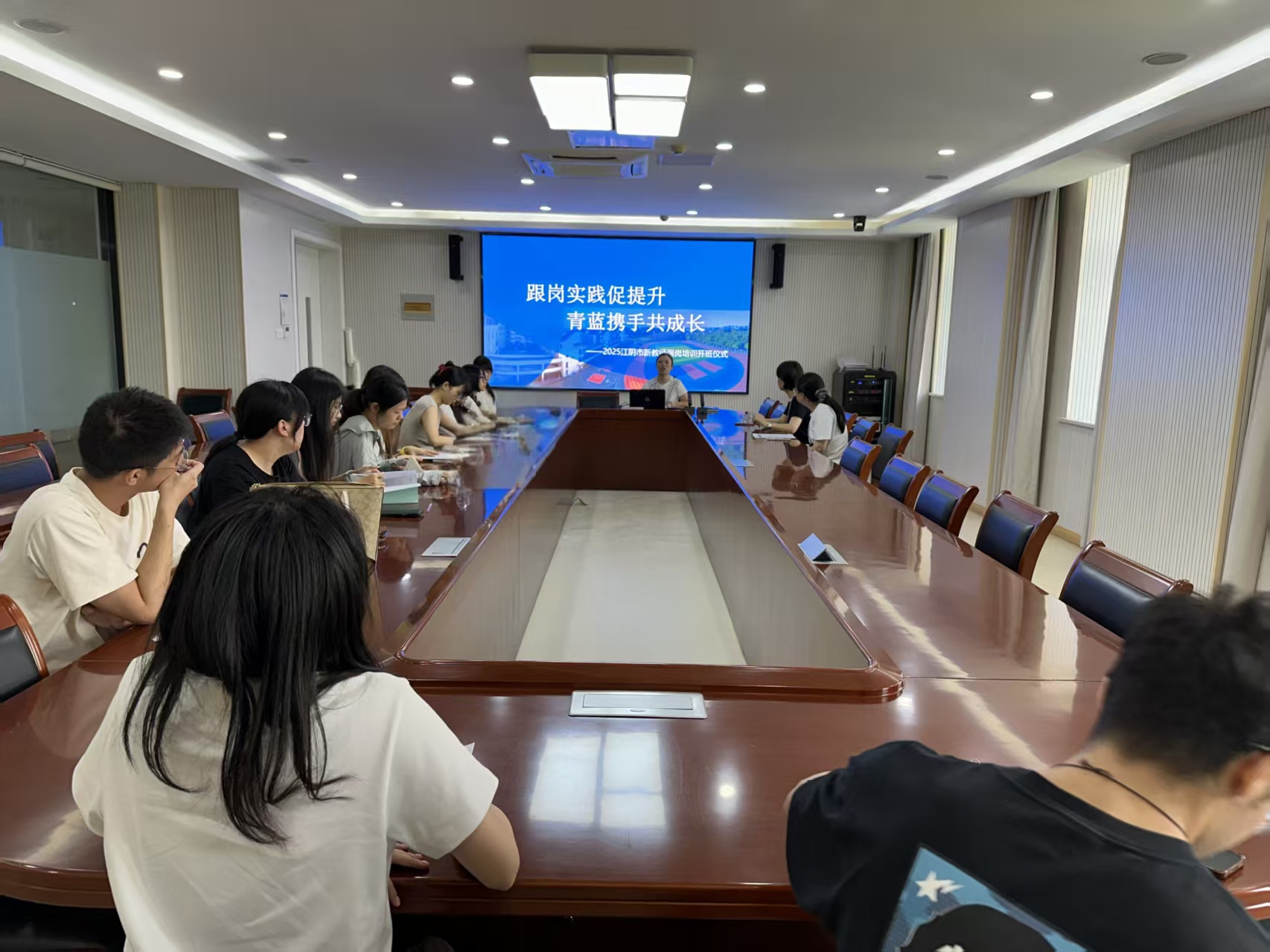 课程结束后,新教师跟岗培训启动仪式随即开展。仪式上,澄江中心小学副校长钱丽明确了跟岗培训任务与要求。她强调,新教师要精读教育专著、研读课程标准、撰写教育论文、开展公开教学,基地校将全力为新教师提供学习进修机会。随后,钱丽校长宣读了师徒结对名单,为新教师成长搭建“传帮带”桥梁。