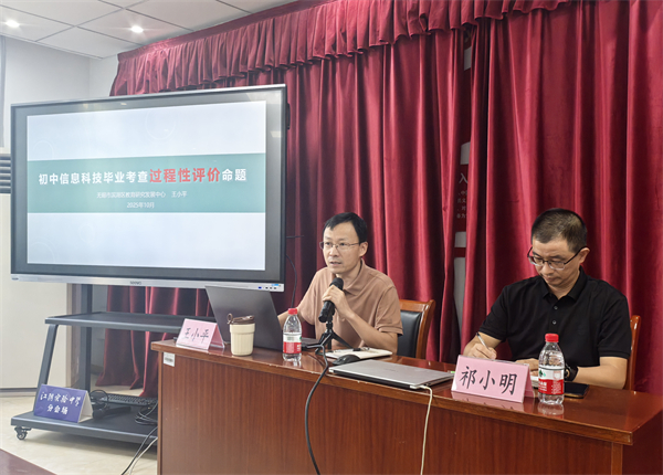 随后,江苏省教育信息化专家库成员、无锡市滨湖区教育研究发展中心王小平老师作专题报告,系统解读了初中信息科技毕业考查过程性评价命题改革方案。报告明确,改革聚焦三大核心方向:一是严格遵循课程标准命题,确保评价与教学目标的精准对接;二是突出素养导向,通过物联网技术、编程逻辑、安全伦理等跨维度试题设计,全面考查学生核心素养;三是创新开放性题型,采用“情境-知识-认知”三维框架,促进学生实践能力培养。在教学实施层面,王老师特别强调采用“大单元教学”模式,通过知识模块整合避免碎片化学习。他指出,此次改革着力构建“课标→教材→课堂→评价”的闭环体系,实现教学评一致性,使试题设计既成为学业质量的标尺,又为课堂教学改进提供依据。
