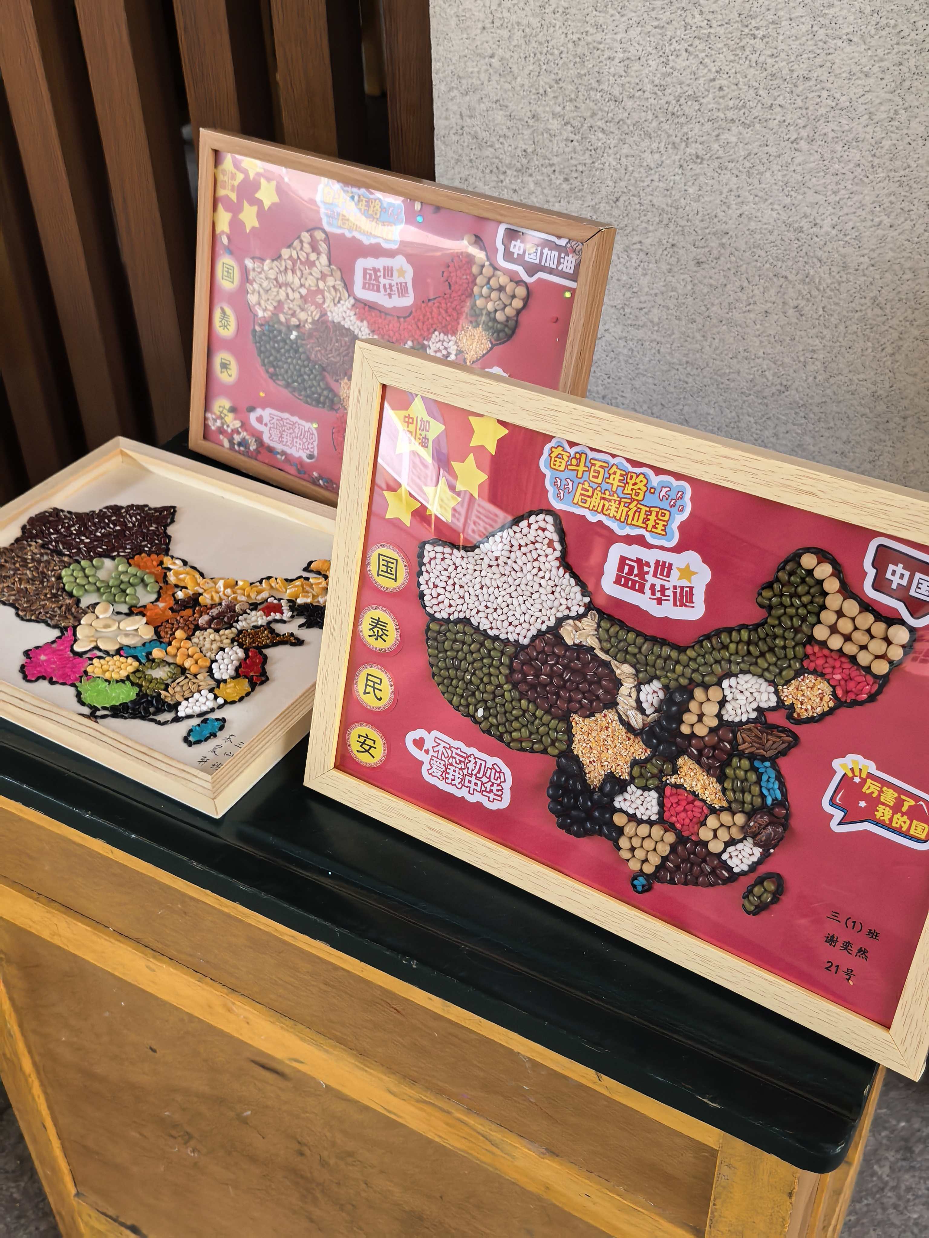 同学们用自己独特的方式,表达对祖国母亲的深切热爱与美好祝福。低年级学生用小小手掌,蘸取斑斓色彩,为祖国地图添上童真的印记;中年级学生则以五谷为材,精心拼贴出祖国壮丽版图,在认识地理风貌的同时,感受“民以食为天”的深厚底蕴与丰收喜悦;高年级学生则从美食、到文化,构建起一幅展现祖国悠久历史与现代科技成就的宏伟画卷,增强了民族自豪感。