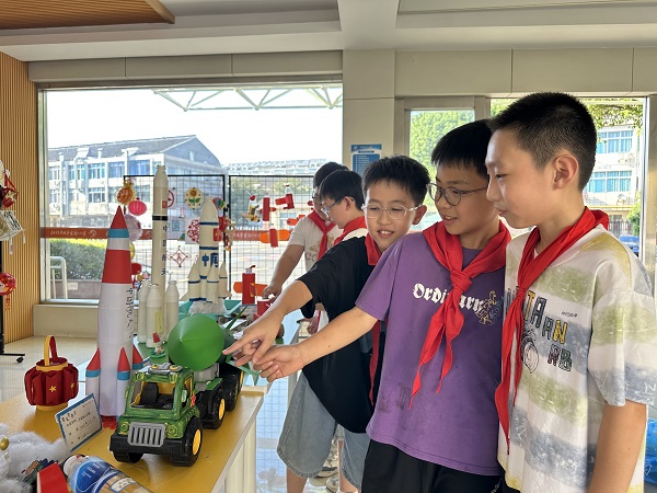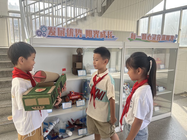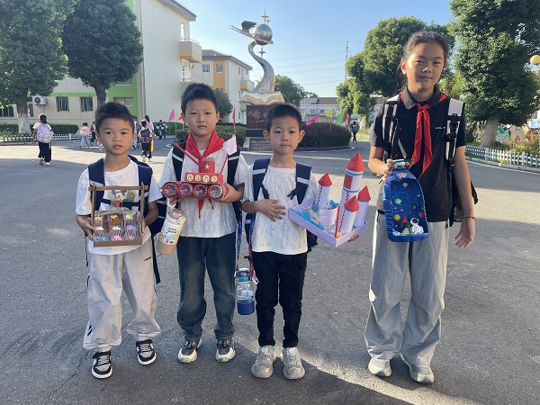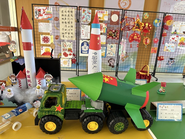 活动中,同学们创意十足。部分同学聚焦科技,结合电路、实景设计趣味作品,承载绿色科技梦;或变废为宝,用水瓶、废纸箱制作航天小模型,在动手间种下航天种子。受大阅兵启发,大家还构思制作坦克、飞机等军事模型,深刻体会“科技强国、军事强国”的意义。