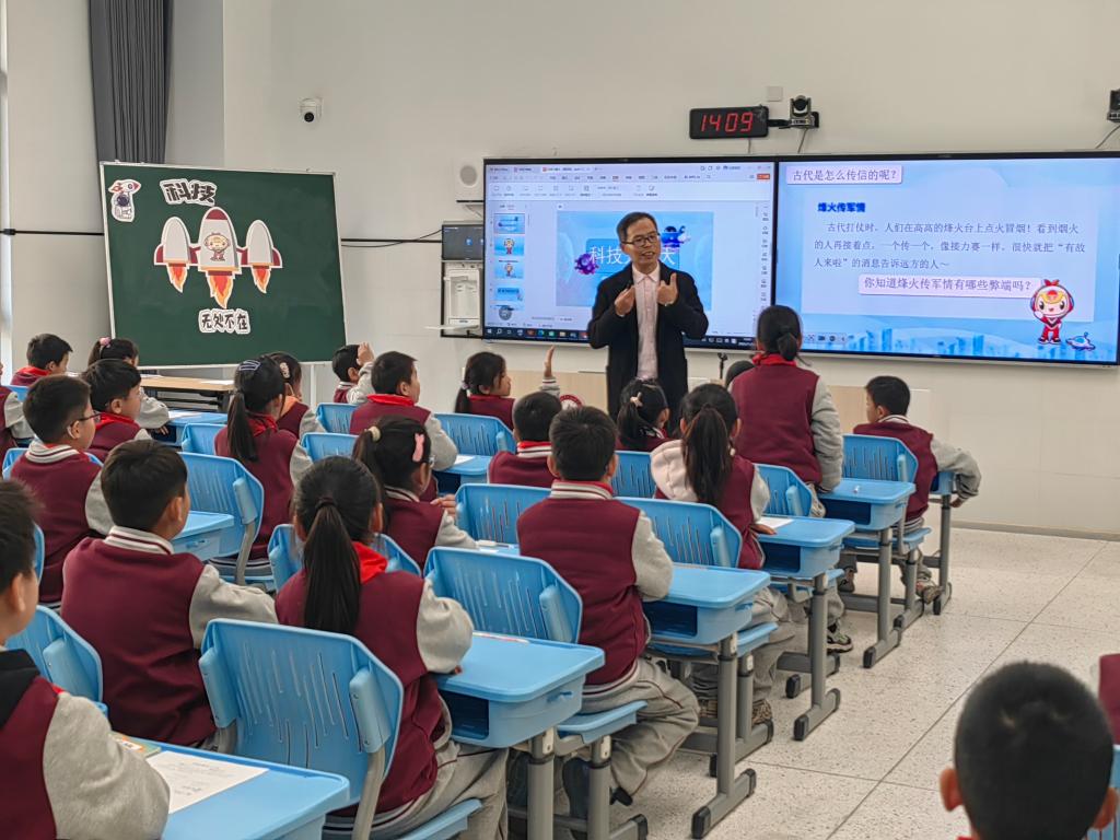 第二堂课是夏君亮老师执教的三年级《科技力量大》。课堂以“科宝收集科技能量”为趣味主线,从“上学方式对比”引出科技概念:“生活探秘馆”里,学生分享身边科技产品,感知科技“无处不在”;“影音照相馆”中,古今通信、衣食住行的直观对比,让学生真切体会科技“改变生活”;“观念解密室”借“孙悟空误解雷电”的情境,引导学生用科学破迷信,改变观念;最后的“教室科技改造”创意设计,更让学生在奇思妙想中萌生“为科技强国出力”的责任意识,将知识与情感深度融合。