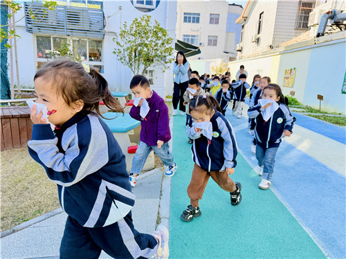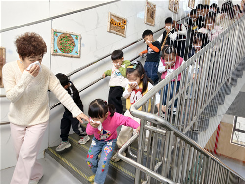 幼儿园组织了一次消防演练活动。演练前,安监办制定了详细的实施方案,明确各岗位教师的职责和疏散路线。随着消防警报声响起,全体师幼迅速进入应急状态。在教师的引导下,幼儿按照应急预案的疏散路线,用湿毛巾捂住口鼻,弯腰快走,“火”速前行撤离到北操场。到达安全地带后,教师立即清点幼儿人数,确保无一人遗漏。演练后,安监办王老师对演练情况进行总结点评,并与孩子们进行消防知识互动问答,在一问一答中,孩子们对消防安全知识有了更加深刻地理解和认识。