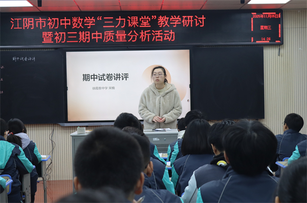 在课堂展示环节,徐霞客中学宋楠老师与江阴初中万小星老师分别呈现了精彩的试卷讲评课。宋老师从知识、方法、能力的角度对期中试卷典型题进行了讲评,着重讲解了求线段长的方法和求面积的方法,培养了学生几何直观、画图能力、推理能力、运算能力。万老师从学生薄弱的知识——圆出发,从圆中的定理,讲到如何审题,规范了学生的解题格式,培养了学生分析能力、推理能力。两节课均体现了“依标扣本、以生为本”理念,为全市试卷讲评课提供了范例。