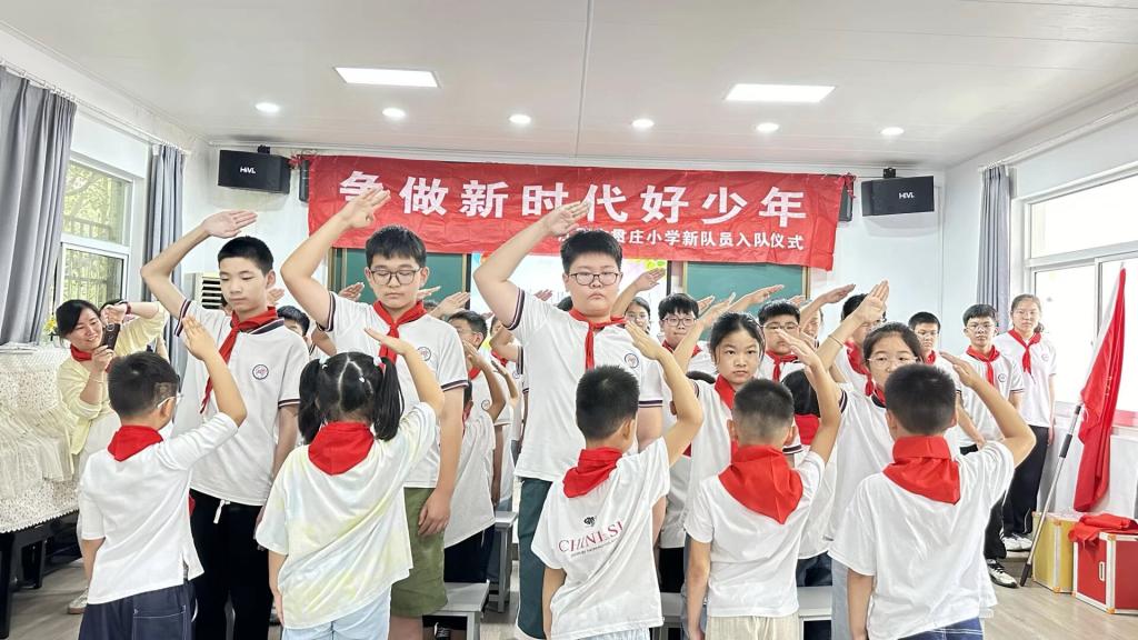 紧接着,在大队长的带领下,全体新队员昂首挺胸,高举右拳,面向队旗进行了庄严的宣誓。“我热爱中国共产党,热爱祖国,热爱人民,好好学习,好好锻炼,准备着:为共产主义事业贡献力量!”铿锵有力的誓言在多功能教室里回荡,表达了新队员们坚定的决心和美好的愿望。