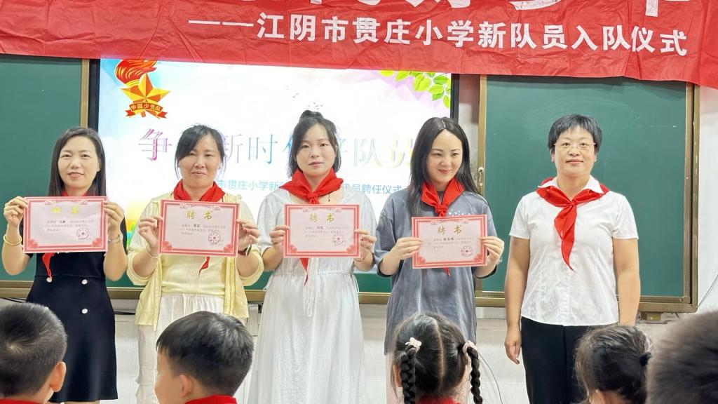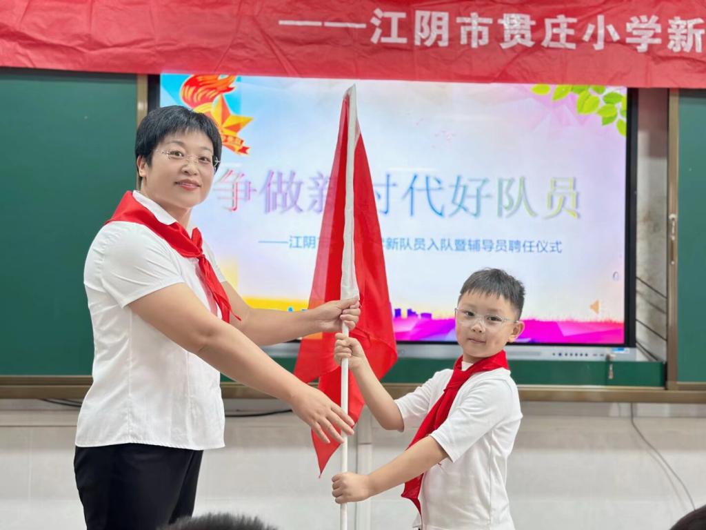 2025年10月13日下午,江阴市贯庄小学在学校二楼多功能教室举行了以“争做新时代好队员”为主题的一年级新生分批入队仪式。当天下午1时,一年级全体师生、家长代表、六一中队全体学生、学校少工委主任、大队辅导员等齐聚一堂,共同见证了这一庄严而富有意义的时刻。
