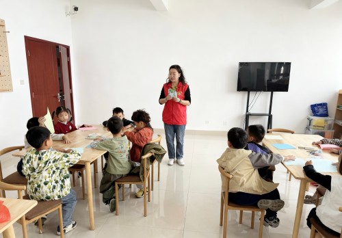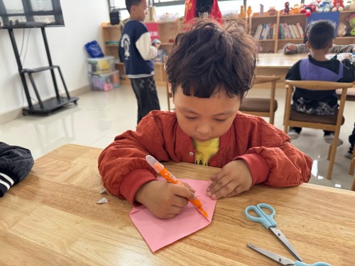 随后,刘静老师带领孩子们进行手工创作。孩子们走出教室,在社区的绿化带中采集了香橼叶、桂花枝等自然材料。回到教室后刘老师耐心指导孩子们制作信封、装饰信纸,并将采集的植物素材巧妙地融入作品中。孩子们专注地折叠、粘贴、绘画,有的信封上点缀着金黄的银杏叶,有的则散发着桂花的清香,每一份作品都寄托着孩子们对秋天的热爱和对家人的思念。