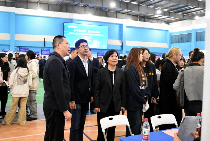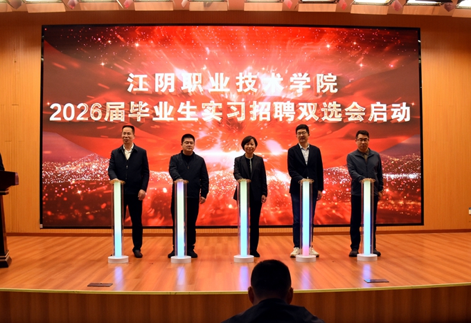 为深入贯彻习近平总书记关于高校毕业生就业工作的重要指示批示精神,根据省教育厅《关于开展江苏省2026届高校毕业生秋季招聘月活动的通知》要求和江阴市委市政府“科创江阴”建设新三年行动方案和教育科技人才一体化发展要求,促进学院毕业生高质量充分就业,11月12日下午,由江阴市教育局、江阴市人力资源和社会保障局主办,江苏省高校招生就业指导服务中心指导,江阴职业技术学院、江阴市职业教育联盟、江阴高新区先进制造产教联合体承办,江阴互鸿新技术科研有限公司协办的“职引新动能 联动助启航”江阴职业技术学院2026届毕业生秋季实习招聘双选会在江阴职业技术学院体艺馆举办。市政府办、教育局、发改委、人社局、工信局、科技局、数据局、商务局,市人力资源管理服务中心、科技人才发展集团等单位领导莅临招聘会现场,学院党委书记潘永惠陪同考察。