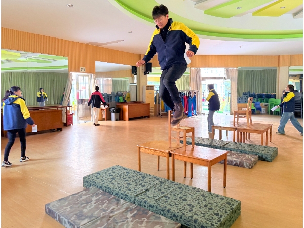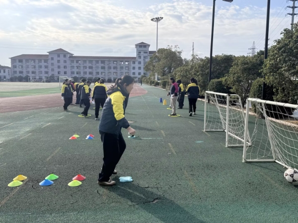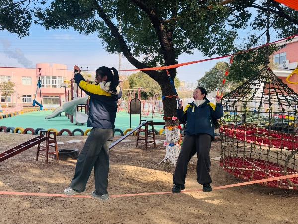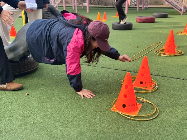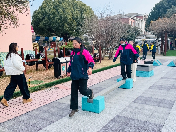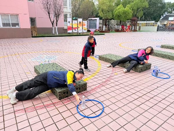在“快乐足球”区,老师们需运球绕桩、跳盘射门,一旁的小裁判紧盯动作,认真裁判;“平板套圈”区,老师们以平板支撑姿势努力套圈,孩子们一边计数一边喊加油;“翻滚取物”区,平时优雅的老师们在垫子上翻滚取物,笑声不断;而在“极限闯关”的攀爬架与悬垂挑战中,不少老师重温了儿时爬高跃下的刺激……