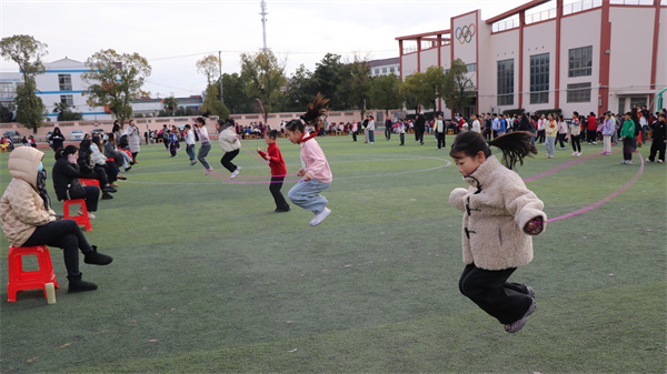 高年级赛事同样精彩纷呈:“双跳(一分钟)”赛场绳影翩跹,选手身轻如燕;“仰卧起坐传球接力”中,队员们仰卧起坐间精准传球,展现团队协作的节奏感;“旋风跑接力”将气氛推向高潮,同学们手持武术棒协同绕杆,即使途中标志杆倒地,也能迅速扶起、继续冲刺,生动诠释了坚持到底的体育精神。