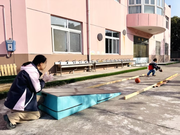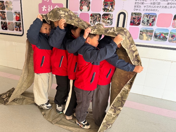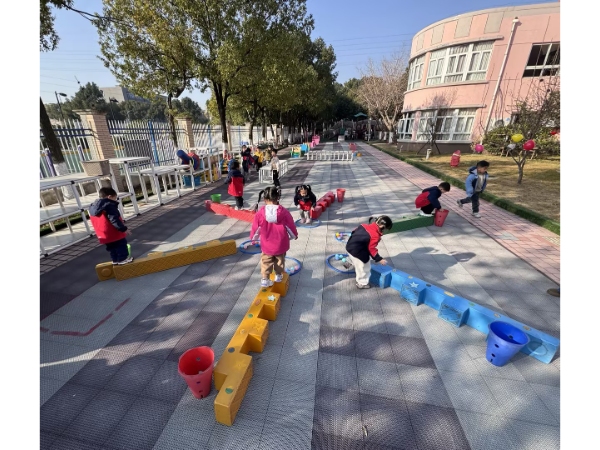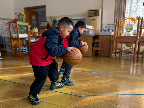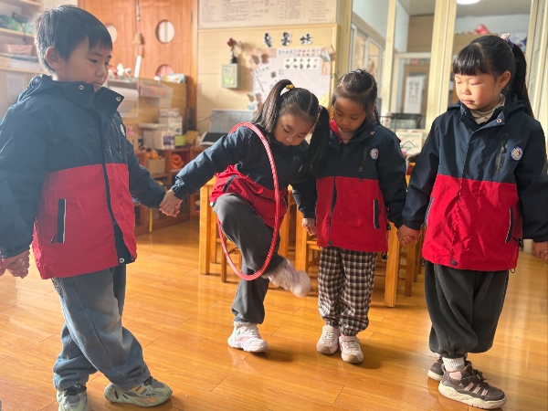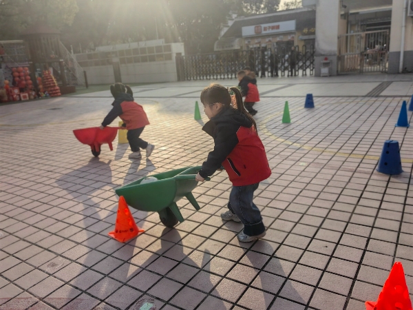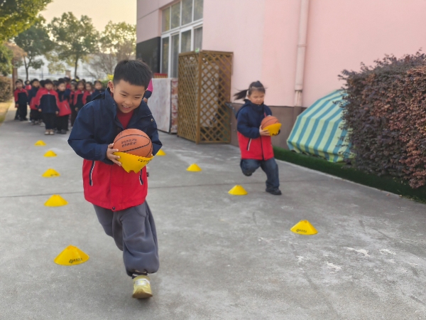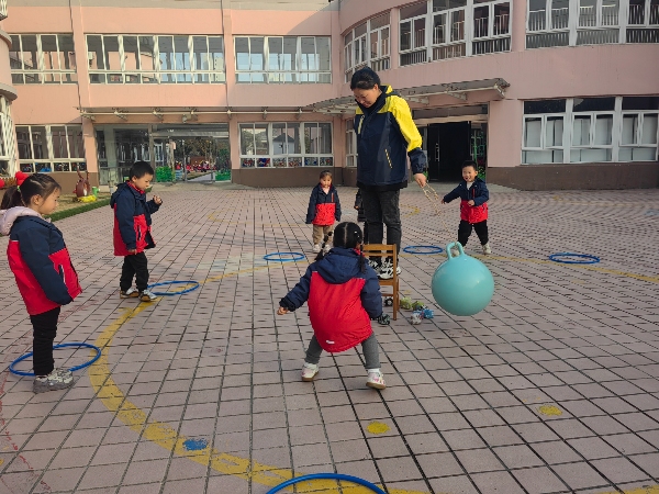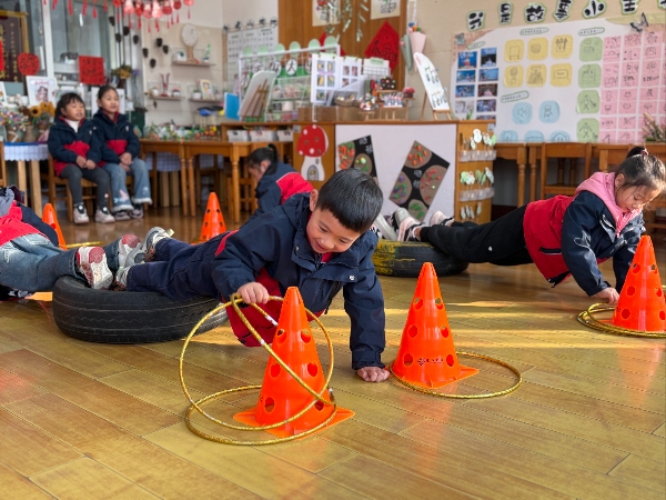大班组的游戏区就像个热闹的大游乐场。孩子们分组参与“一圈到底”,呼啦圈在大家的默契配合下从起点传到终点;以平板支撑姿势抓取圆圈、套向圆锥桶,展示出孩子们超强的四肢耐力和身体控制能力;“拍球走绳”游戏中,孩子们沿着不同形状的绳道行走,同时保持拍球不落地,平衡和控球能力都得到了很好的锻炼;“无限大循环”里,孩子们围圈传球后快速跑到队尾,在接力中感受节奏与协作;“旋风跑”中,幼儿共同握住器械,绕着标志杆完成路线挑战;“车轮滚滚”游戏里,大家一起转动“车轮”,全力向终点冲刺;“不倒森林”“搭桥过河”“母鸡下蛋”等游戏也同步进行,孩子们专注配合、灵活跳跃,在遵守规则的同时学会了合作与互助,欢笑声充满整个幼儿园。