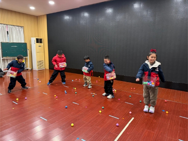 中班游戏区同样热闹非凡,各班的特色游戏同步开展,每个游戏区都挤满了跃跃欲试的小身影。“小松鼠运果子”趣味十足,孩子们一步步将“果子”运到终点,成功时脸上洋溢着自豪的笑容;“福气满满运粮赛”充满节日氛围,孩子们个个化身“运粮小能手”,手推小车稳稳地把“粮食”送回“家”;“蚂蚁搬家”的小队员们齐心协力,全程紧紧护住“食物”,充分展现了互助配合的精神;“躲避大摆锤”游戏充满挑战与刺激,欢呼声此起彼伏;“赶鸡入笼”创意十足,成功完成任务的小朋友都顺利获得了“福”字贴纸;“接力旋风跑”速度与技巧并存,每组队员都拼尽全力为团队争光。
