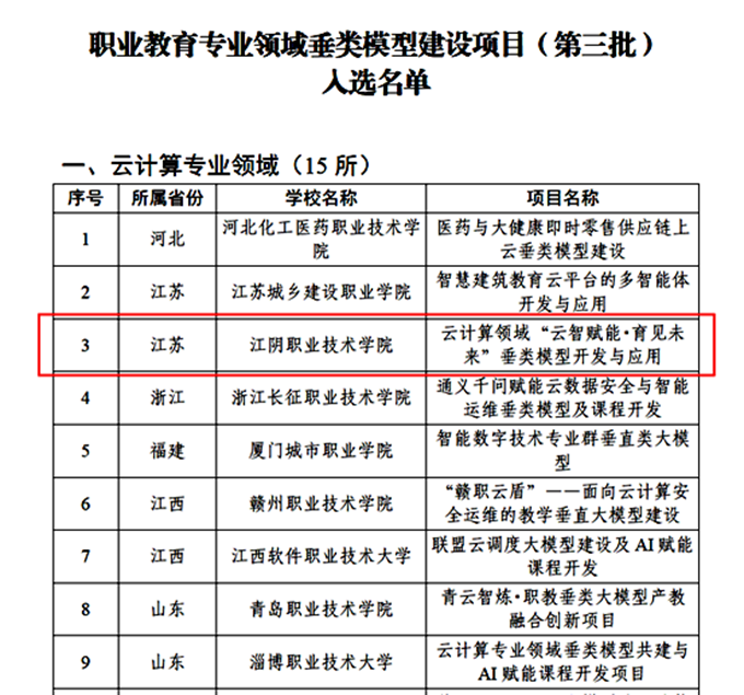 12月18日,教育部职业教育发展中心公布了职业教育专业领域垂类模型建设项目(第三批)入选名单。由学院党委书记潘永惠领衔申报的“‘云智赋能·育见未来'垂类模型开发与应用”项目成功入选。此次入选国家级项目,标志着学院在深化产教融合、推进人工智能与云计算技术赋能职业教育方面迈出了坚实一步。
