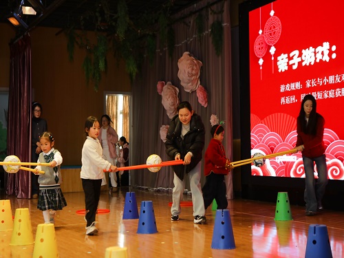 紧接着的“福球进筐合家欢”游戏环节将活动推向了高潮。“接球”游戏中,孩子们随着音乐将球抛进爸爸妈妈手中的筐子里,每一次成功都伴随着孩子们开心的笑声;“夹玩具”游戏考验着孩子和家长的协作能力,两人一组用身体夹住毛绒玩具向终点前进,小心翼翼的模样逗得在场老师忍俊不禁;还有“步步登高夹福球”的游戏,孩子们积极和爸爸妈妈合作,也收获了满满的成就感。每一个游戏都充满了童趣与挑战,孩子们在游戏中体验合作的乐趣,感受新年的喜悦。