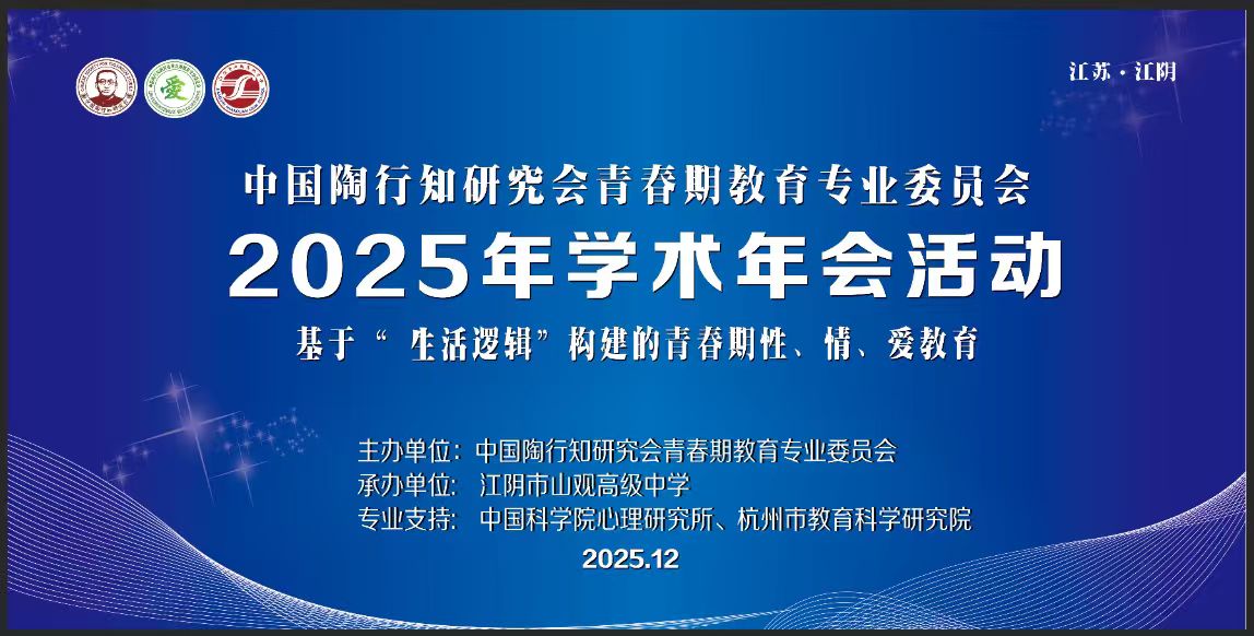 12月19日至20日,中国陶行知研究会青春期教育专业委员会2025年学术年会在江阴市山观高级中学成功举办。本次年会汇聚全国多地教育专家、一线教师及家长代表,以“基于‘生活逻辑’的青春期‘性、情、爱’教育”为主题,深入研讨青春期教育实践路径,凝聚育人共识。活动由中国陶行知研究会青春期教育专业委员会主办,中国科学院心理研究所提供专业支持。