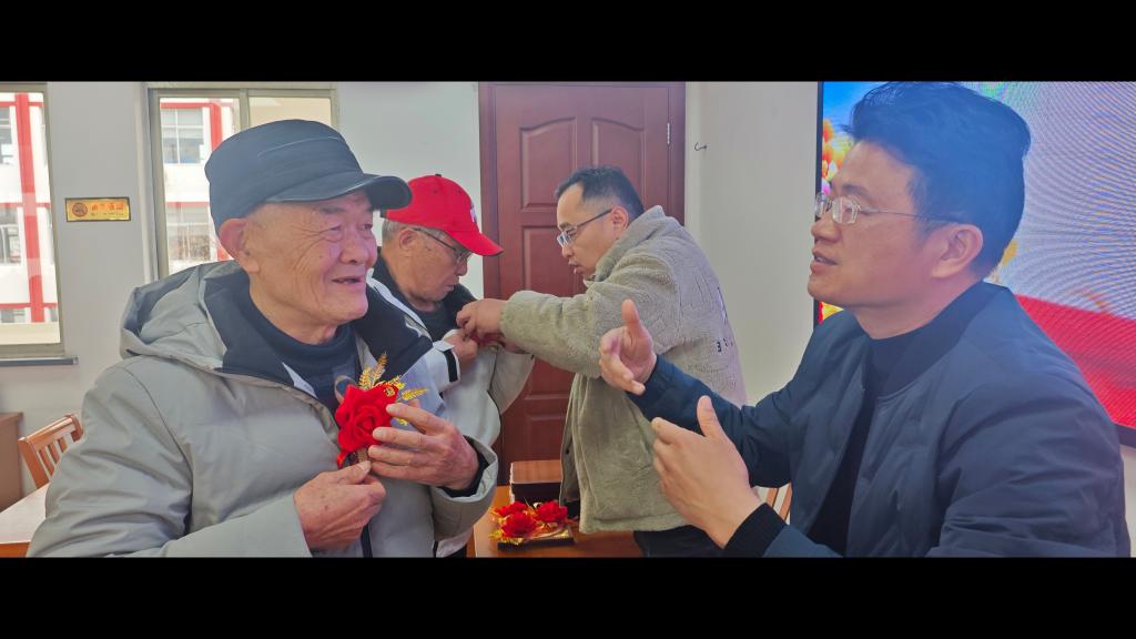 祝寿环节中,校领导为沈锦丰等老寿星佩戴红花并送上真挚祝福。寿星代表沈锦丰老师动情发言,抒发了对学校的深厚情谊。