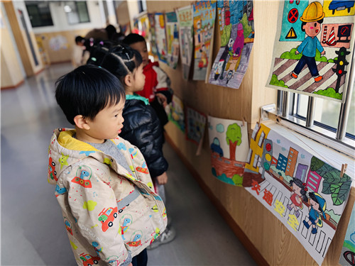 为进一步筑牢幼儿交通安全防线,让安全理念扎根童心,幼儿与家长携手创作,用五彩画笔将交通安全知识绘成充满童趣的画作——有的画着遵守信号的小汽车,有的画着走斑马线的一家人……园部将优秀作品进行展览,幼儿在教师的带领下有序参观,他们相互分享着自己的创意,讨论着画作中的安全知识,在潜移默化中加深了对交通安全的认知。