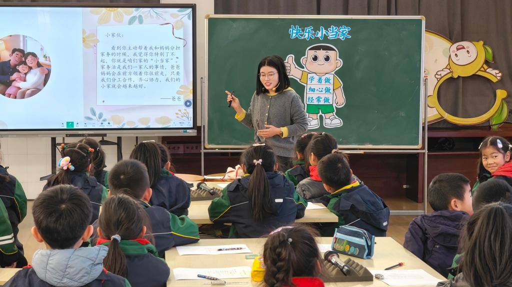 随后,陶福梅老师带来《快乐小当家》,以生动的“AI小屋情境”引入,引导学生化身“小小观察员”,发现家庭劳动的真实需求。课堂通过“说说做过的家务”“找找劳动工具”等环节,将认知具象化,在“小小技术员”实践环节中,学生以小组合作形式亲身体验叠衣、扫地、擦桌等劳动,在“学着做、细心做、经常做”的引导下,初步掌握家务技巧与方法。教学更以“爸爸妈妈的语音留言”触动情感,以“一周家务计划表”推动行动,巧妙融合劳动技能、家庭责任与情感教育,诠释了“快乐当家”背后蕴含的成长意义与家庭温度。